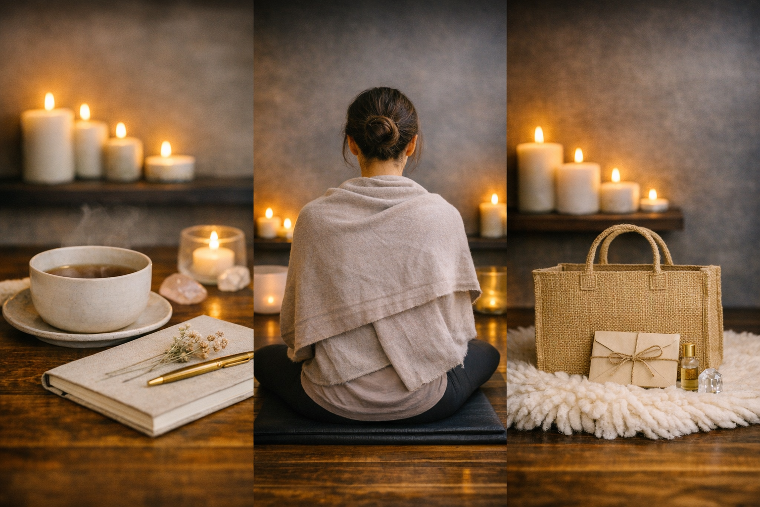 Includes: A minimalist, thoughtfully curated set of ritual essentials — a natural‑fiber tote, double‑glass tea infuser with bamboo lid, lavender linen eye pillow, and three raw crystals (Rose Quartz, Moonstone, Carnelian).